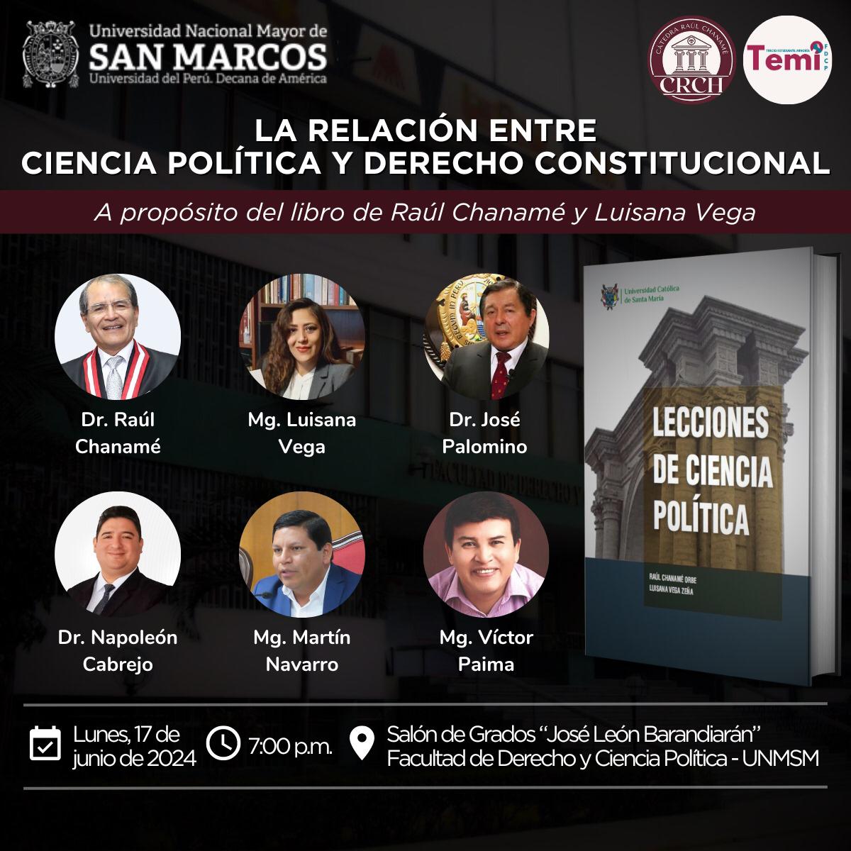 La Universidad Nacional Mayor de San Marcos (UNMSM) será el escenario de un destacado evento académico titulado «La relación entre Ciencia Política y Derecho Constitucional», que se llevará a cabo el lunes 17 de junio de 2024 a las 7:00 p.m. en el Salón de Grados «José León Barandiarán» de la Facultad de Derecho y Ciencia Política.